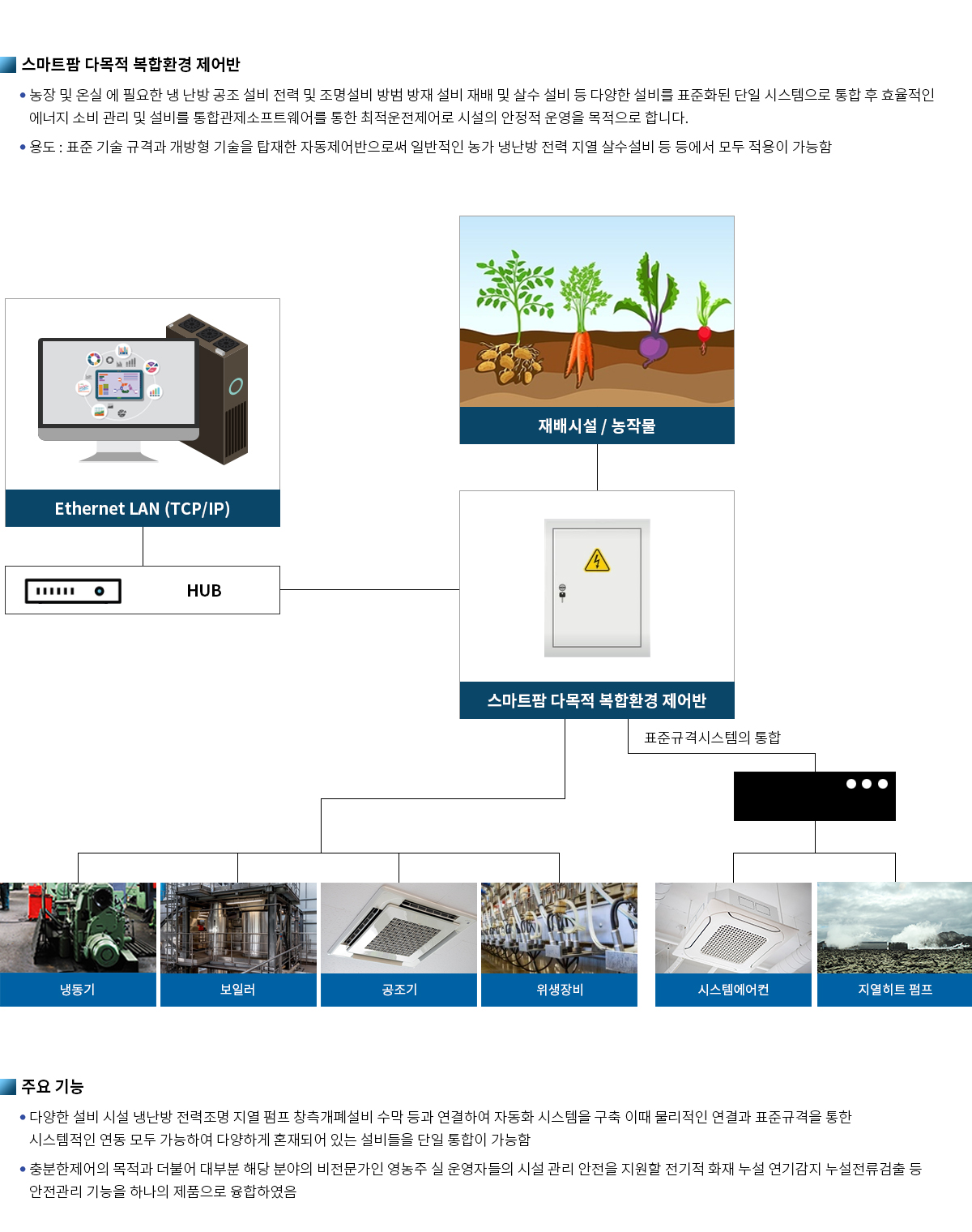 농장 및 온실 에 필요한 냉 난방 공조 설비 전력 및 조명설비 방범 방재 설비 재배 및 살수 설비 등 다양한 설비를 표준화된 단일 시스템으로 통합 후 효율적인